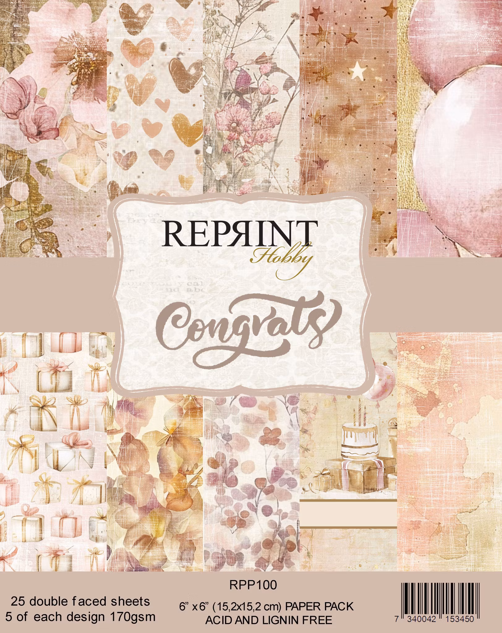 Förpackning med 25 dubbelsidiga, mönstrade ark i 6x6" (5 av varje design). Mått: 6x6"Serie: Congrats